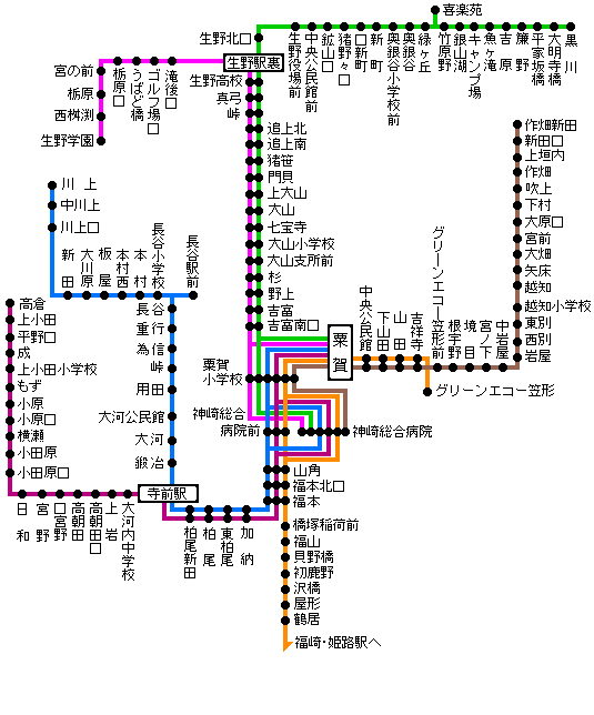 | 神崎総合病院 | 喜楽苑 | 【往路】月〜土1 休日0 【復路】月〜土0 休日0 | 粟賀経由 | |