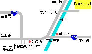 姫路、龍野方面からは国道179号線太田井橋交差点で右折、北へ約1Kmの徳久小学校付近の