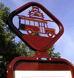 ![]() 姫路城観光ループバス専用の停留所標柱。 姫路城にボンネットバスを彫ってオシャレなデザイン。 |